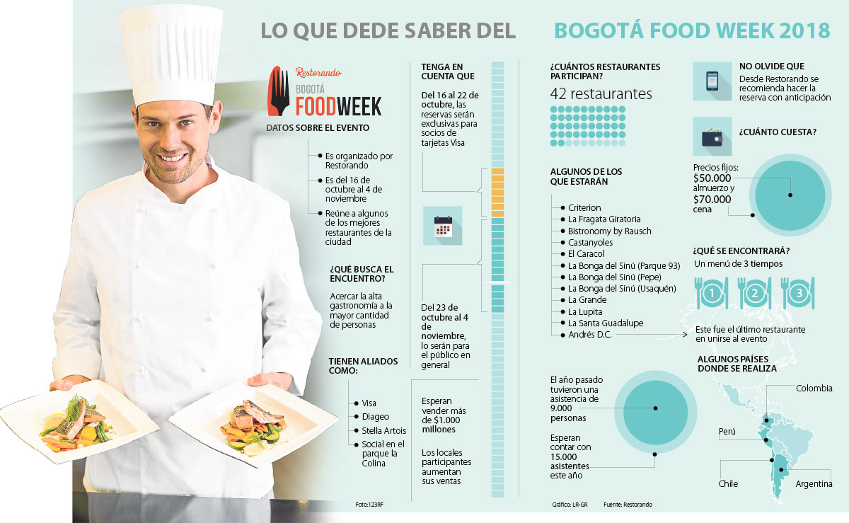 Desde el 16 de octubre y hasta el 4 de noviembre los amantes de la cocina se encontrarán con propuestas gastronómicas bastante variadas, las cuales incluyen comida colombiana, internacional, de mar, entre otras ofertas. Esta variedad en el menú se debe a que hay 42 establecimientos participantes, como: La Fragata Giratoria, Bistronomy by Rausch, Castanyoles, El Caracol, La Bonga del Sinú (Parque 93), La Lupita y otros.