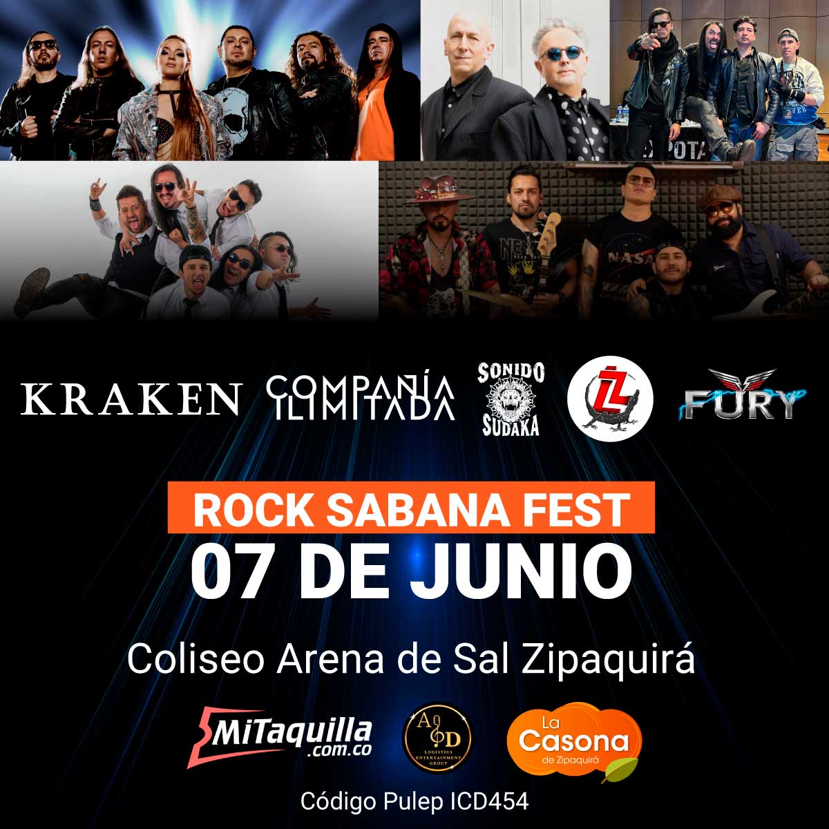 Bandas exponentes del rock colombiano como Kraken, Compañía Ilimitada, Sonido Sudaka, The Lizard y Fury se tomarán el Coliseo Arena de Sal en Zipaquirá, este 7 de junio con el Rock Sabana Fest. No olvide que el evento reunirá lo mejor del talento rock que alberga el país. Si desea asistir a este concierto, los boletos están disponibles desde $56.000.