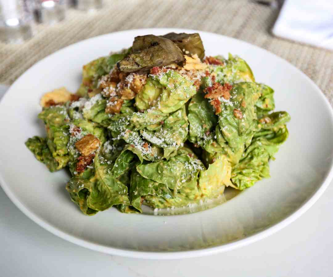 Versión de ensalada César con cogollos de lechuga romana, queso parmesano horneado, crotones de focaccia y tocineta. También tiene una emulsión de alcachofa y anchoas. El plato es mezclado en frente del comensal.