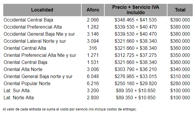 Los interesados podrán adquirir sus boletas a través de Tuboleta, desde este viernes 10 de mayo, con precios que oscilan entre $100.000 y $320.000. Cabe aclarar que si la compra se realiza por medio de la página web, movil o contact center tendrá un costo adicional ($10.000 Situado en punto de venta y $7.000 por el E-ticket y Mobile Ticket).