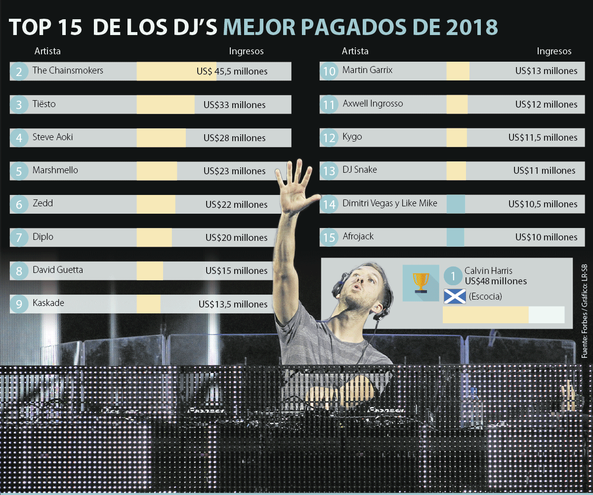 Por sexto año consecutivo Adam Richard Wiles, más conocido como Calvin Harris figura como el DJ mejor pagado del mundo, mientras que Anton Zaslavski, quien es conocido como Zedd, es el que más puestos escaló durante el último año, de acuerdo con el ranking de Forbes que clasifica a los músicos de este género por salario.