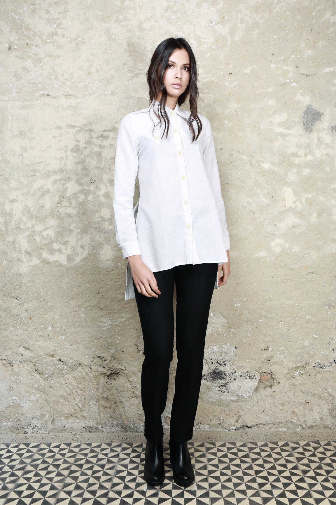 Tiene la meta de no generar desperdicio, sus diseños se realizan con insumos como algodón reciclado y PET como es el caso de esta camisa blanca de inspiración militar. Se reinventa el proceso de desarrollo de cada prenda, se confecciona con stock muerto y telas locales.