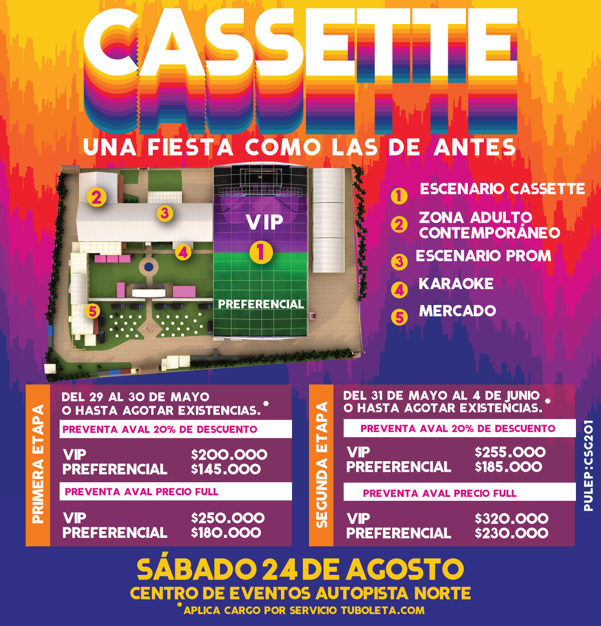 Haciendo el TBT perfecto y mirando unas décadas atrás, no podíamos tener mejores anfitriones para devolver la cinta en pleno 2019; por eso juntos por primera vez en Bogotá y en dos escenarios alternos, CASSETTE será el festival para los amantes de la música que extrañan los clasicos de finales de siglo pasado.