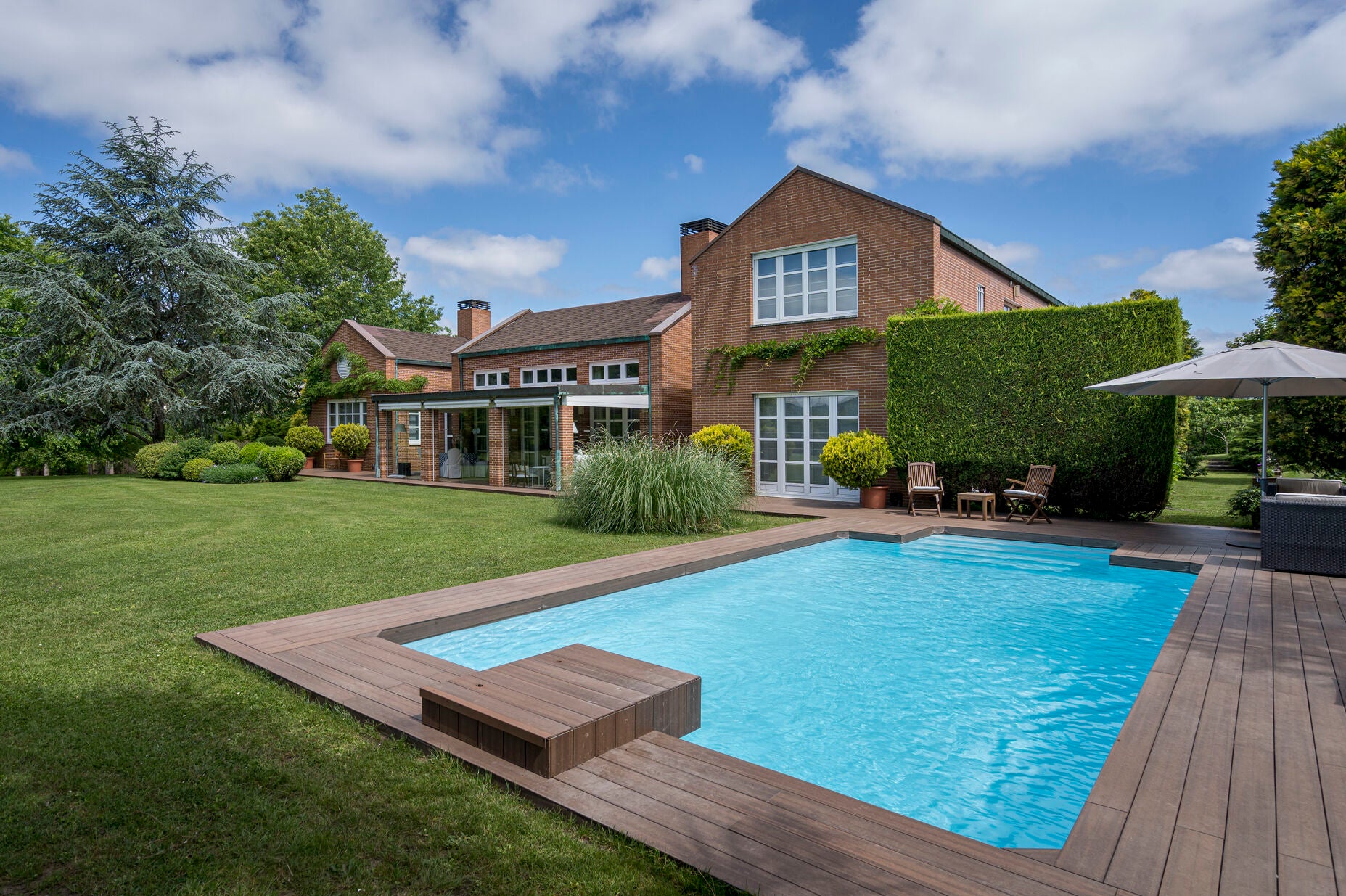 La propiedad destaca por su amplio salón, con chimenea, biblioteca y techos altos de madera con vigas vistas. Con seis dormitorios, el principal con baño en suite dispone también de bañera de hidromasaje, doble vestidor y salida directa a la piscina. Vende Engel & Völkers, por 1,1 millones de euros US$1 millones.