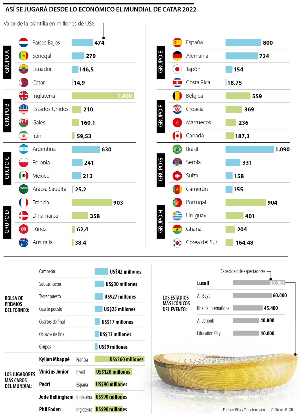 El local, con un valor de plantilla de US$14,9 millones, es el más débil del torneo, pues su plantilla representa solo 1% de lo que vale la de Inglaterra, que es la más costosa con US$1.400 millones. Brasil y Portugal le siguen en el listado de los más poderosos, mientras que Argentina es séptima en este escalafón con US$630 millones.