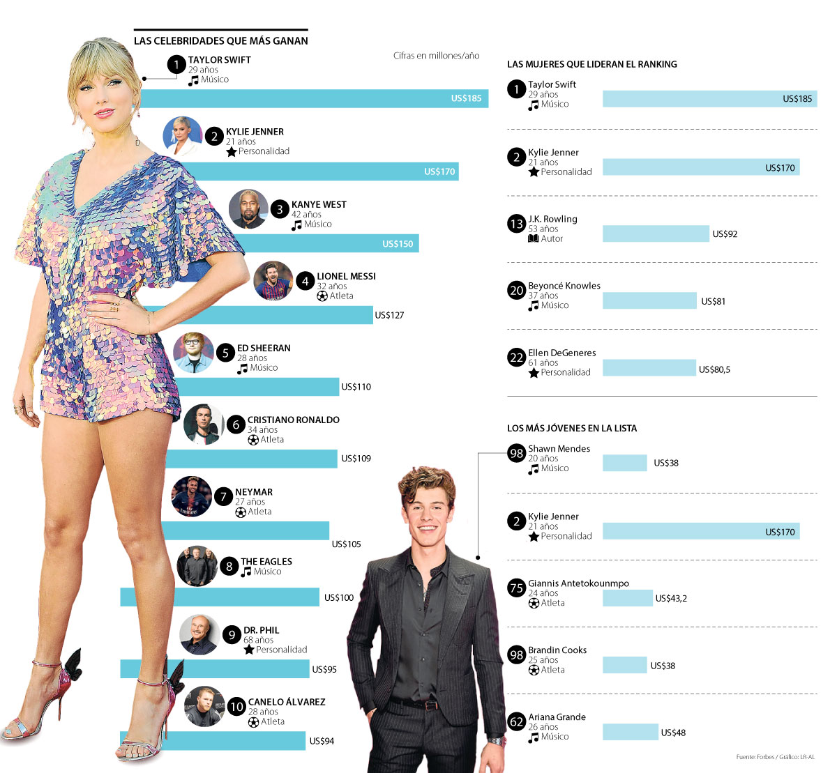 A partir del cuarto lugar aparecen los deportistas, una categoría que por ganancias encabeza el futbolista argentino Lionel Messi. El contrato 2020-2021 que tiene el astro con FC Barcelona le significa un pago de US$80 millones al año.