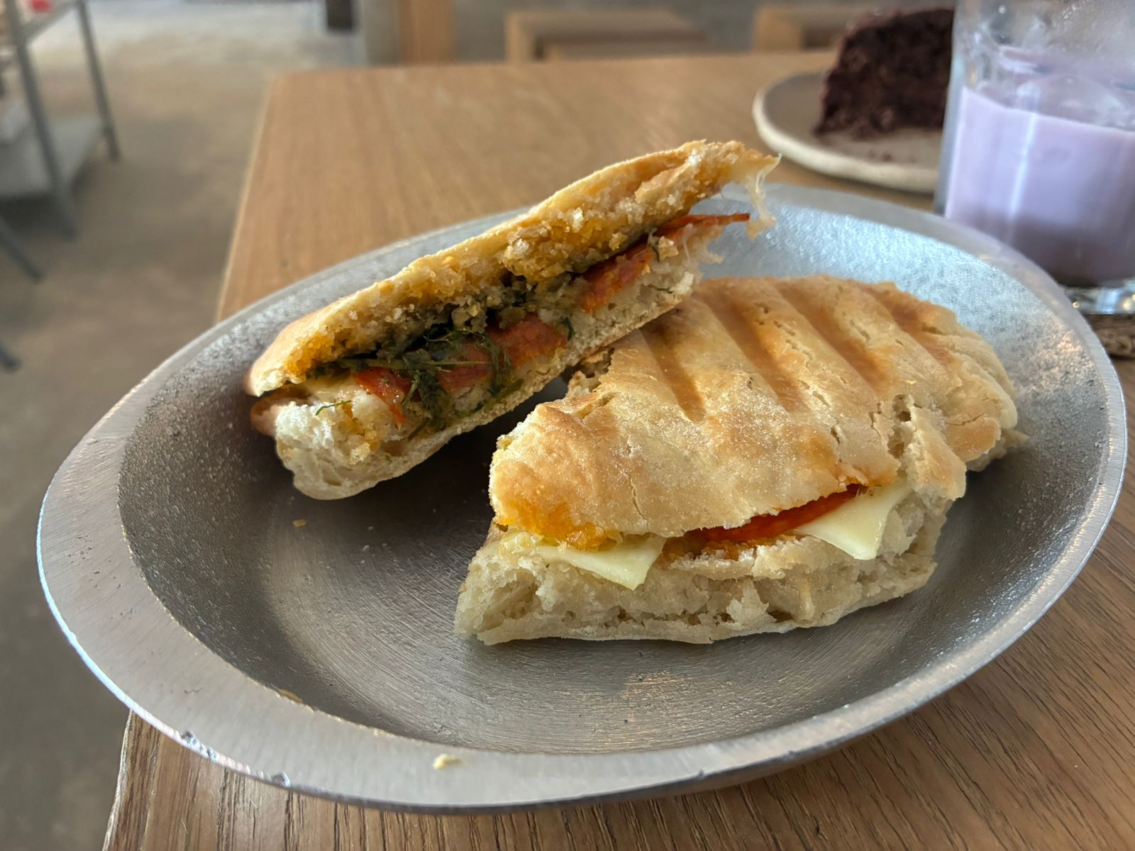 El sánduche de pepperoni apuesta por la sencillez bien ejecutada. Pan tostado con textura crujiente por fuera, queso fundido en el punto exacto y el toque del pepperoni equilibrado con aceite de cilantro que da frescura.