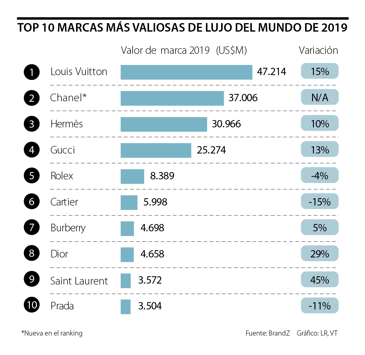 Pese a que Louis Vuitton lidera el ranking de las 10 marcas de lujo más valiosas de BrandZ por 14º año consecutivo, con un valor de marca de US$47.200 millones en el último año, Chanel entró al listado por primera vez, ubicándose en el puesto número dos del ranking de lujo.