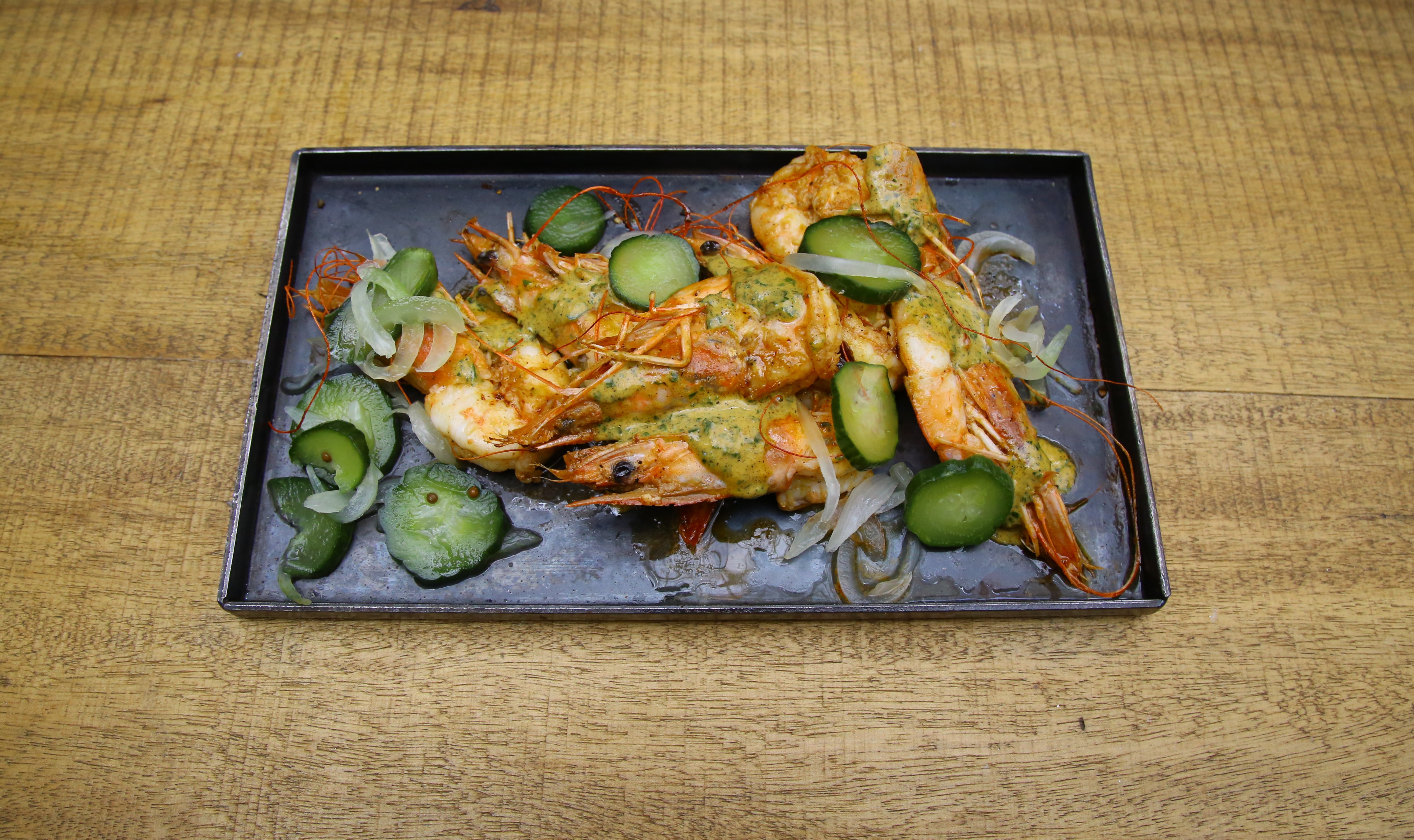 Gambas al ajillo servidas en una cama de cebolla y acompañadas de pepinillos.Otras opciones