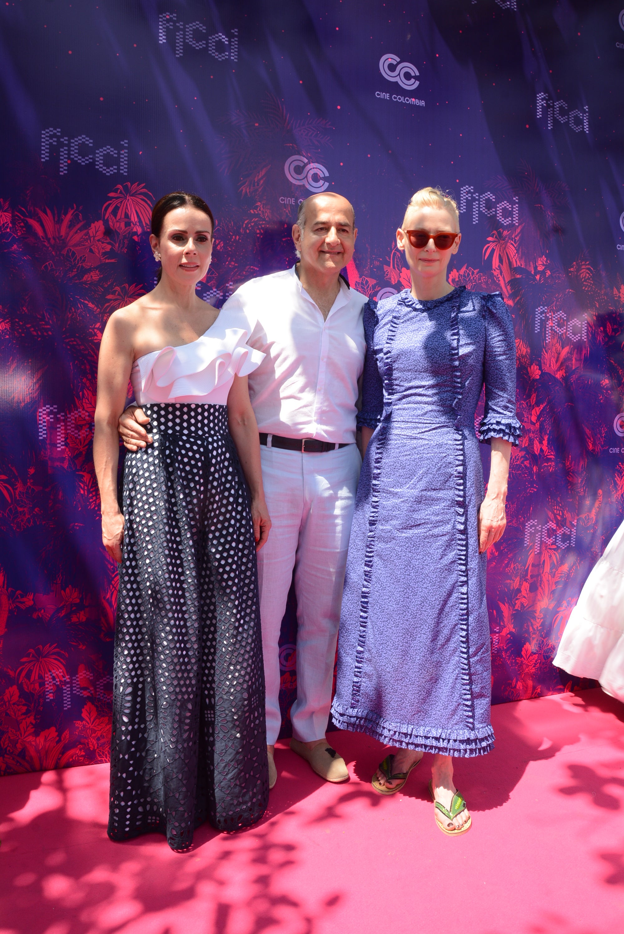 Patricia Tascón de Falah, el presidente de Cine Colombia Munir Falah y la ganadora del Oscar, Tilda Swinton, invitada especial este año.