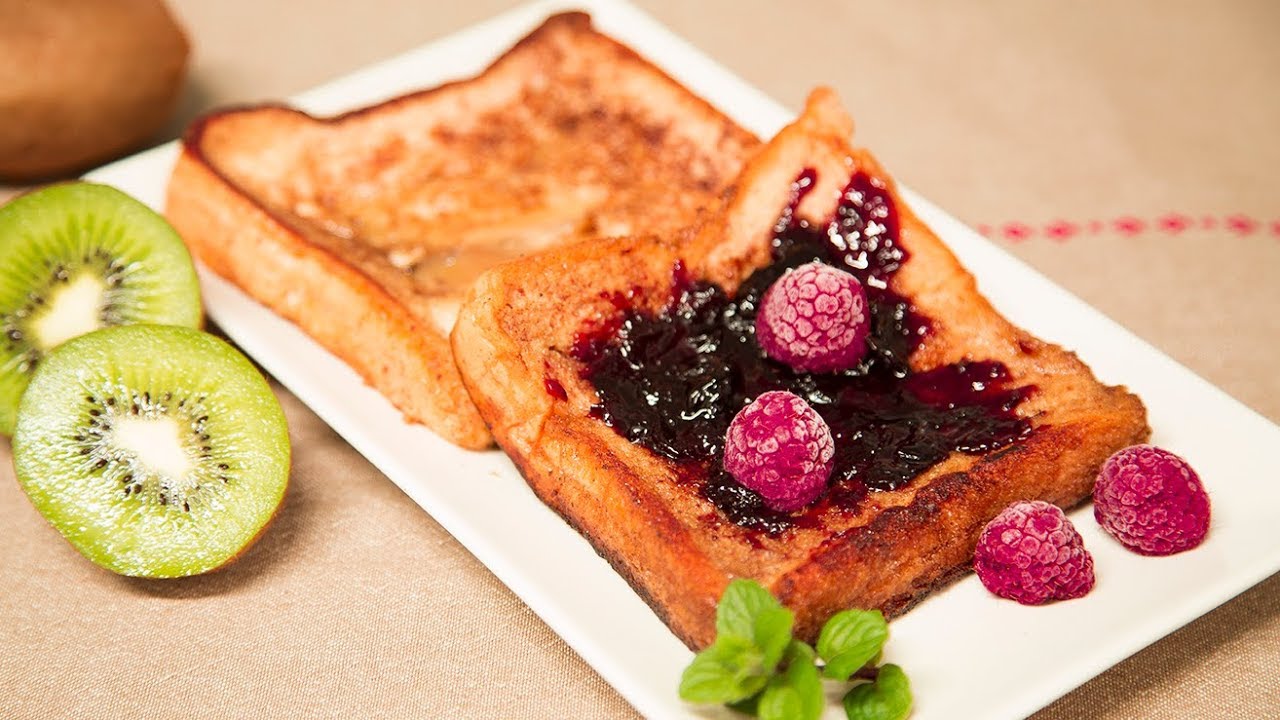Cuatro unidades de pan molde tajado, un huevo, una taza grande de harina de trigo, una cucharadita de polvo de hornear, una cucharada de canela en polvo, media cucharada de azúcar, miel de abejas o miel maple, una cucharada de mantequilla, fresas, arándanos y banano.