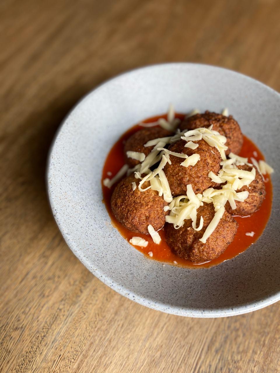 En cuanto a las albóndigas: picamos finamente la cebolla y la salteamos con aceite de oliva, en un bol ponemos la carne (o las tres carnes) y mezclamos con la cebolla, sazonamos con un poco de sal y pimienta, agregamos los huevos; incorporamos la harina, adicionamos la crema de leche y el perejil liso, revolvemos con las manos (lavárselas muy bien antes de hacerlo), armamos las bolitas, es más fácil hacerlo si tenemos las manos mojadas. Freímos, durante 4 minutos, las albóndigas en una olla llena de aceite, mezclamos las albóndigas con la salsa napolitana y las dejamos cocinar durante 4 minutos, agregamos hojas de albahaca picadas, sazonamos con un poco de sal y una pizca de azúcar, dejamos cocinar 2-3 minutos más y servimos y agregamos queso parmesano al gusto.