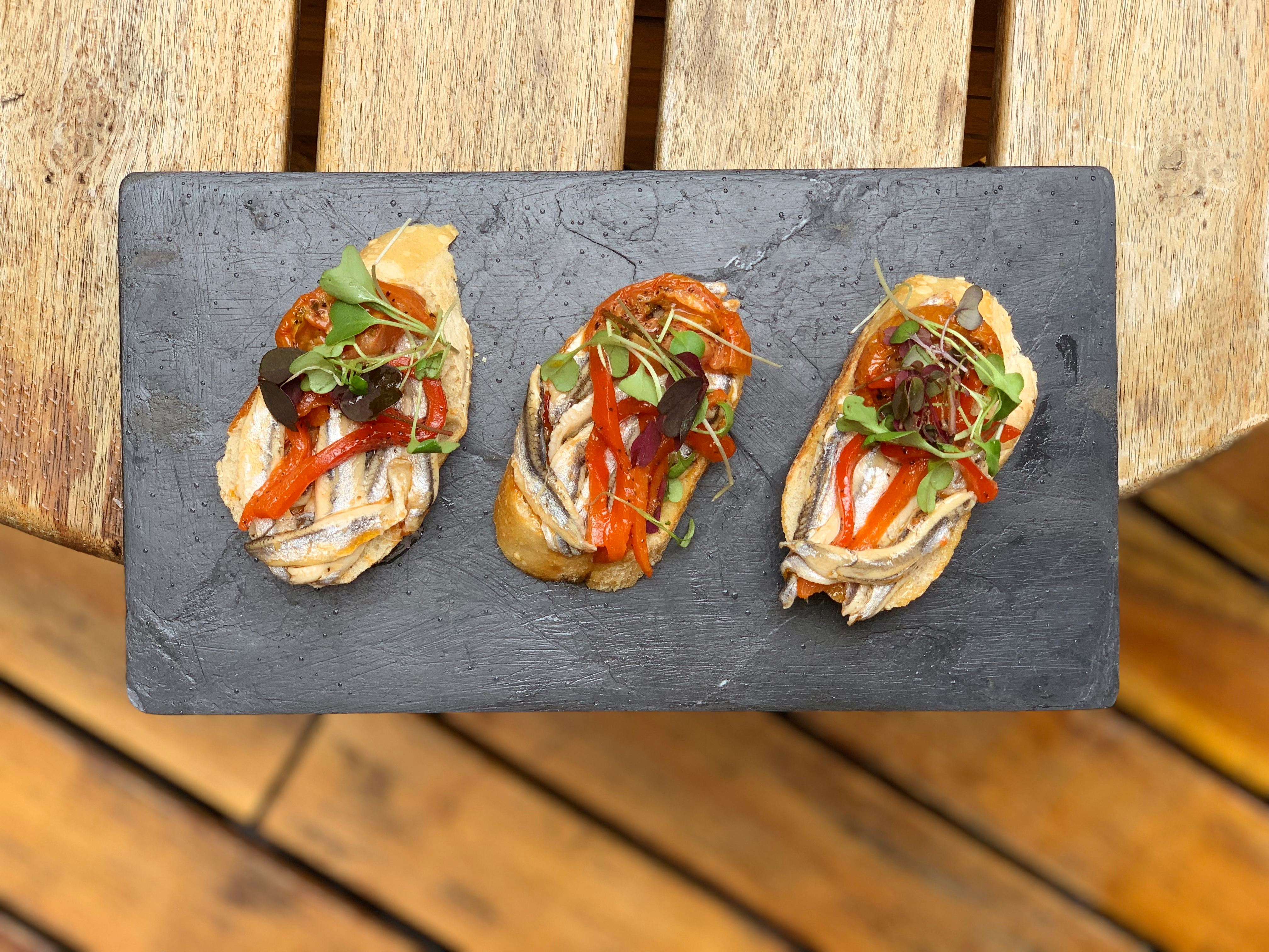 Luego emplatamos, untando un poco de mantequilla al tostón, se pone al horno por unos dos minutos, en la parte de arriba le colocamos los champiñones al ajillo y lo decoramos con jamón serrano