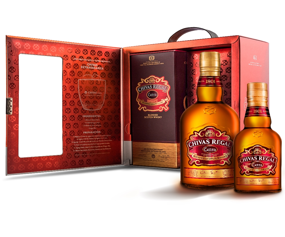 Chivas Regal Extra, en la categoría súper premium, presenta su edición especial para fin de año en un empaque llamativo, que evoca la época navideña y ofrece una receta sugerida para disfrutar de la bebida. La presentación cuenta con una botella 700ml y una de 375ml, perfecta para tomar solo, en las rocas o en un coctel, lo que la hace una bebida versátil perfecta para compartir con seres queridos.