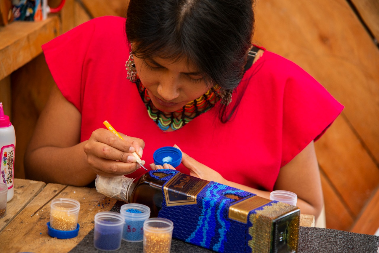 Las botellas fueron decoradas manualmente por artesanos del país con las técnicas mopa mopa, chaquiras y tamo de trigo, en alianza con Artesanías de Colombia.