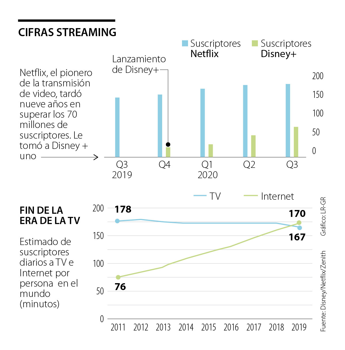 Las cifras de consumo de internet en minutos, comparadas con las de TV en 2019 estarían marcando el fin de la era de la televisión como la conocemos (ver gráfico) y un gran impulso de este cambio se dio por el auge de las plataformas de streaming que cada vez generan más contenido. El más reciente jugador es Disney +, que logró en un año 70 millones de suscriptores, cifra que le tomó a Netflix cerca de nueve periodos. Y al cierre del año la expectativa es mayor, ya que hace 10 días desembarcó en Latinoamérica, región donde tiene buenas proyecciones.