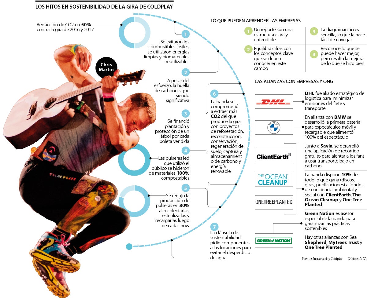 La experta Lozano resalta la importancia de la medición. “Lo principal es medirse, compararse con uno mismo. Ellos (Coldplay) saben cuánto CO2 emitieron, eso es importante porque las estrategias de sostenibilidad deben hacerse conociéndose y sentando una línea base del impacto que tiene la empresa”.