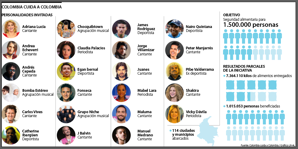 Colombia cuida a Colombia es la mayor iniciativa cultural y de medios en Colombia que tiene por bandera la solidaridad entre ciudadanos en estos momentos difíciles. Varias empresas, más de 300 organizaciones sociales y más de 80 artistas decidieron unirse a la Red de Bancos de Alimentos de Colombia para recoger fondos que serán distribuidos en alimentación y salubridad para familias en situación de vulnerabilidad en la pandemia.