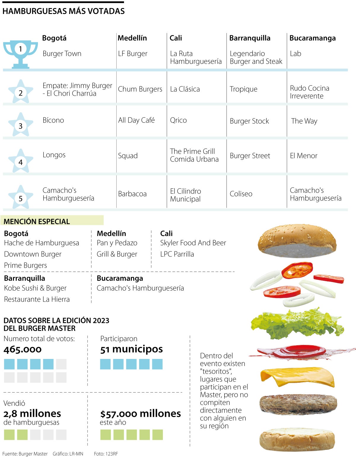 La capital fue tomada por una ola de sabor; se vendieron un total de 827.163 hamburguesas en los más de 50 restaurantes participantes. La hamburguesa más votada por los capitalinos fue la “Sexy Town” de Burger Town. Quizás la ‘sensualidad’ de la hamburguesa atrapó a los comensales. Mermelada de tomate cherry; queso asado artesanal proveniente de Sopó, Cundinamarca; carne de res black angus y un ingrediente crujiente, un secreto muy ‘sexy’, fueron los encargados de despertar el deseo de los bogotanos.