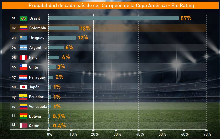 Estos resultados son producto de la metodología Elo rating. Esta técnica consitió en proyectar todos los partidos jugados por los 12 equipos que disputarán la Copa América 2019 durante los últimos 4 años para establecer una base histórica. Posteriormente esos umbrales se convertirán en probabilidades de victoria en resultados y diferencias de goles.
