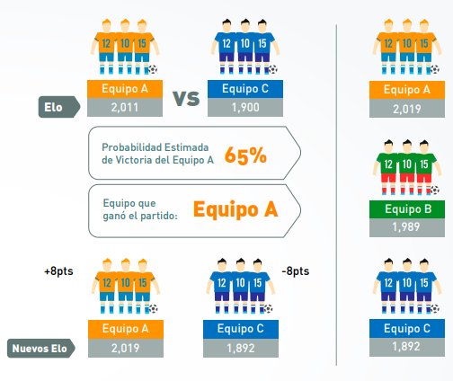 Cuando se enfrentan dos equipos con el mismo nivel de fortaleza relativa (mismo Elo Rating), el modelo predice 50% de probabilidades de ganar para cada uno. Si ambos equipos juegan un partido y gana el equipo A, a este equipo se le suman los mismos puntos Elo que se le restan al Equipo B por perder el partido.Es decir, así como en un partido usual, el sistema otorga y resta puntos para establecer la fortaleza de los ensambles. Por ejemplo, si un equipo muy fuerte le gana a un equipo débil, este recibe pocos puntos a su favor, pues se espera que este gane. Pero si un equipo débil sorprende a uno fuerte, recibirá una mayor cantidad de puntos.