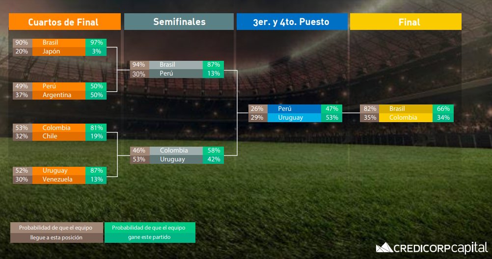 De acuerdo con los resultados, el escenario más probable es que la final se juegue entre Colombia y Brasil, coronando al segundo como campeón de la copa. Mientras, Bolivia y Catar serían de los equipos con un desempeño débil en los partidos.