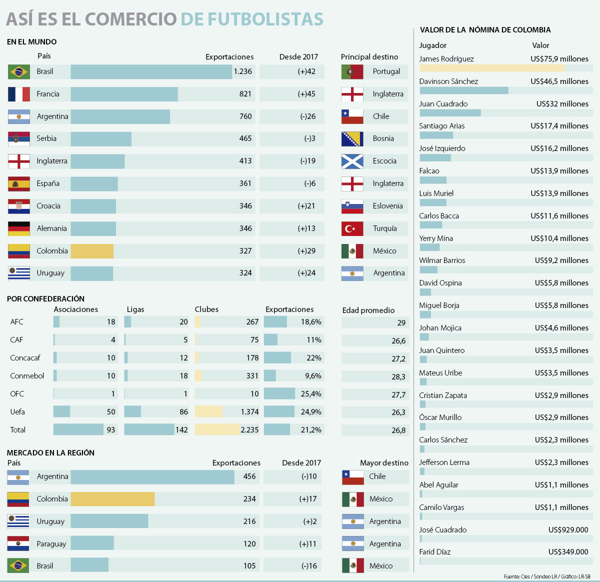 Si bien la Federación Colombiana de Fútbol habla de una venta cercana a 408 futbolistas, el país figura en el noveno lugar del listado que lidera Brasil con 1.236 jugadores que actúan en el fútbol internacional.