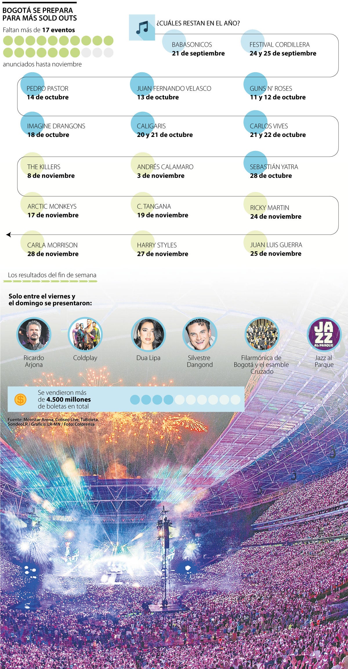 Dua Lipa y Coldplay, con shows en Salitre Mágico y el Estadio El Campín, lograron vender más de 29.000 y 84.000 boletas, respectivamente. Marcando la entrada al Festival Cordillera que se realizará el 24 y 25 de septiembre con más de 30 artistas como Mon Laferte; Café Tacvba; Maná y Draco Rosa, entre otros.