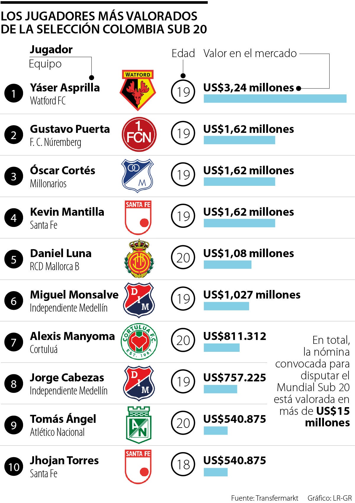 Hoy será el debut de la Selección Colombia en el Mundial Sub 20 de Argentina. La tricolor debutará ante el conjunto de Israel, y pese a la juventud, en el combinado nacional se encuentran jugadores que ya figuran en el fútbol internacional. En total, la convocatoria juvenil está cotizada en un poco más de US$15 millones.