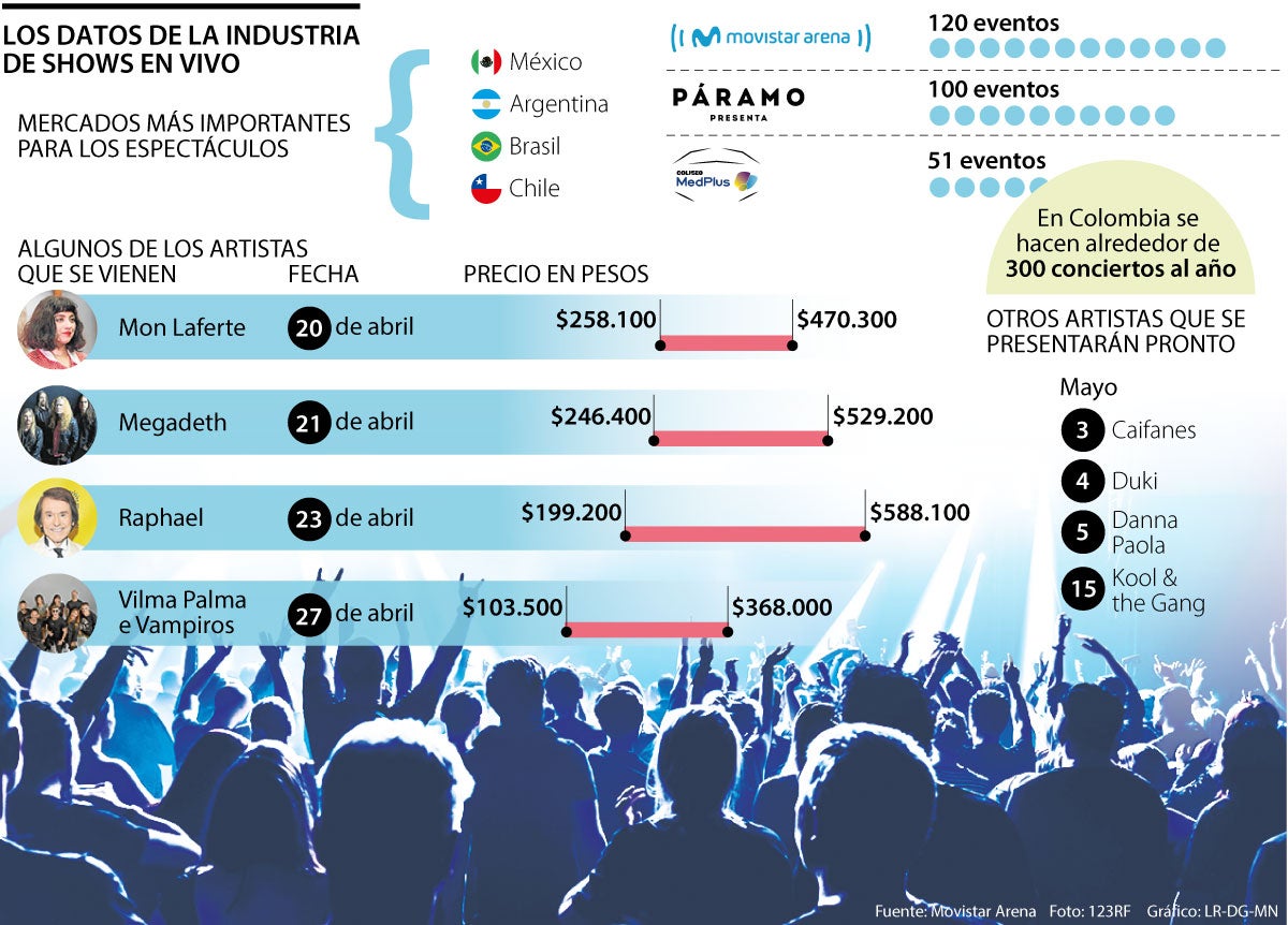 Por algo, el Índice Global de Influencia Musical incluyó a Colombia como uno de los países del mundo que demuestra su distinción por su singularidad de música global, junto con Brasil o Irlanda. Como se dijo, todo esto es debido en gran parte a las nuevas arenas para espectáculos que ya hay en el país. “Desde que se creó el Movistar Arena esto le dio otra dimensión a los conciertos en el país, sumado a que El Campín volvió a ser un sitio importante para conciertos”, dijo Villalón.