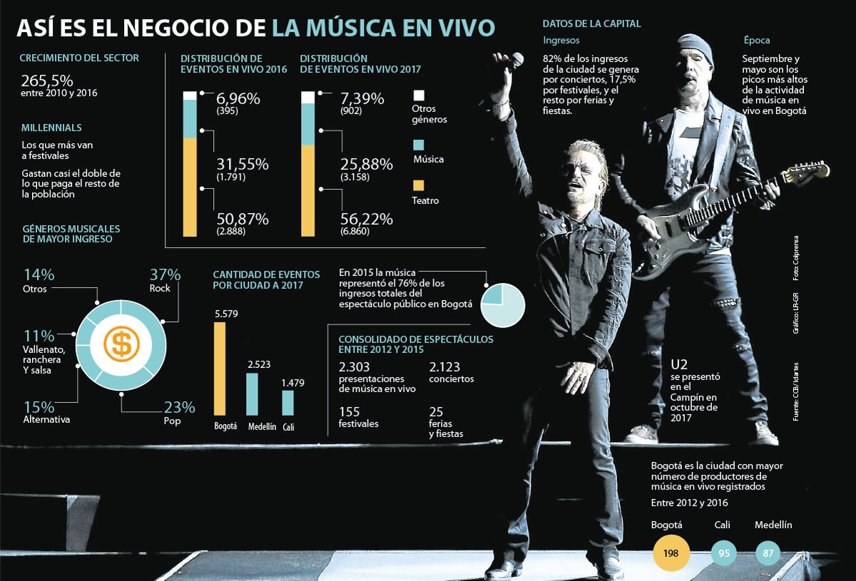 Nombres como los de U2, Bruno Mars, Justin Bieber o Paul McCartney han jalonado esta industria que de acuerdo con el Cluster de Música de la Cámara de Comercio de Bogotá, en 2017 presentó un aumento de 76% respecto a 2016. Este boom se explica si se tiene en cuenta que durante el año pasado se realizaron 3.158 eventos de este tipo, es decir, 1.367 más que los que se realizaron durante el calendario del año anterior.