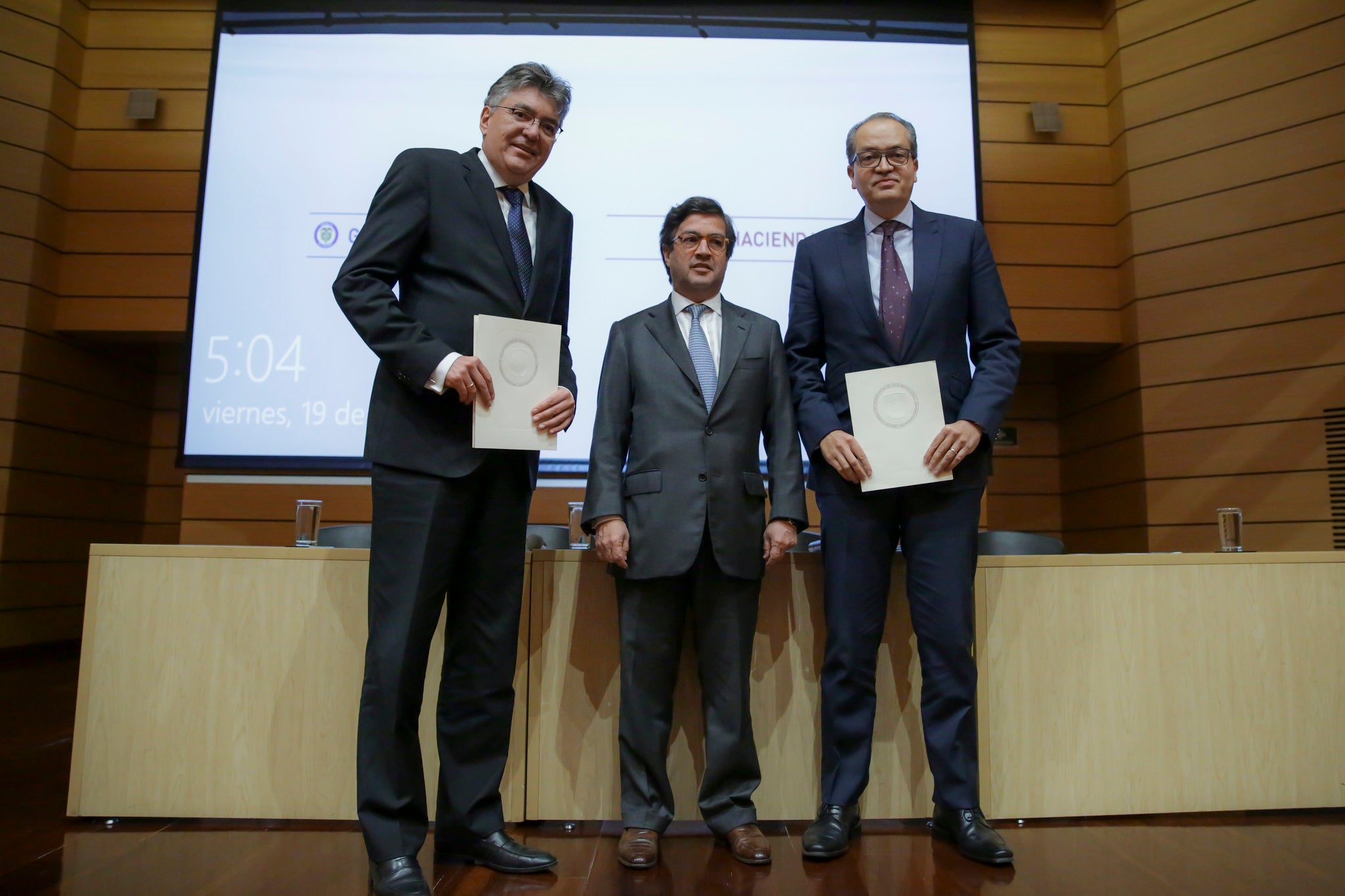 Mauricio Cárdenas Santamaría, ministro de Hacienda y Crédito Público; Luis Alberto Moreno, presidente del Banco Interamericano de Desarrollo (BID); y Fernando Carrillo Flórez, procurador general de la Nación.