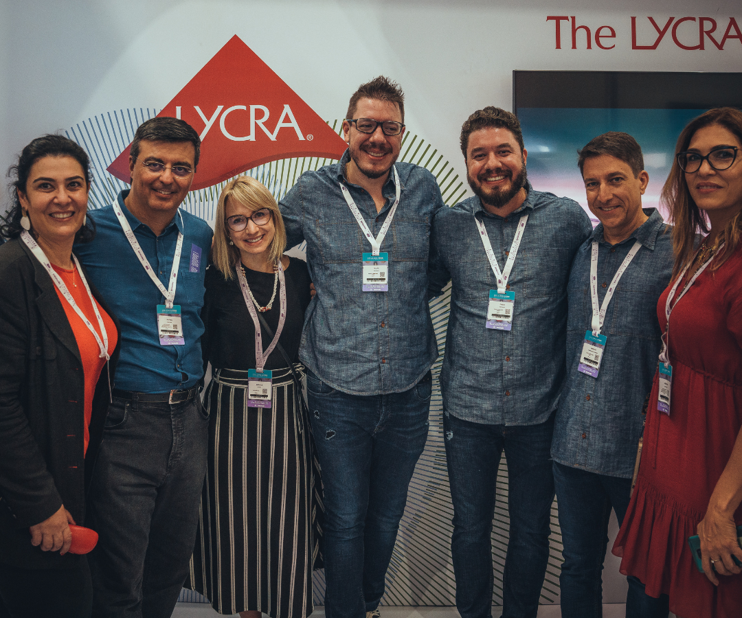 Foto: Adriana Morasco, de Lycra; Rafael Cervine, de la Asociación Brasileña de Industria Textil; Mariele Christ, de Apexbrasil; Fabio Covolan y Marcio De Menezes Coimbra de Textil Canatiba; y Adriana Baraccat de la Asociación Brasileña de Industria Textil.