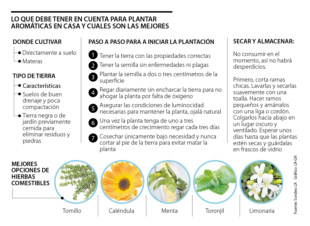 El cultivo de hierbas comestibles es muy fácil y tiene beneficios para la salud. Por ejemplo, en la congestión nasal el tomillo es una de las estrellas de las huertas urbanas; de igual forma la caléndula, que funciona para la gastritis y las úlceras; la menta es un energizante, y el toronjil mejora la digestión. Las semillas se pueden encontrar en viveros de Medellín: Tierra Negra y Lluvia Verde; Bogotá: Sierra Santa; Bucaramanga: Bukaflor; Cali: Siembra Color y Marinela, y Barranquilla: Tronco de vivero.