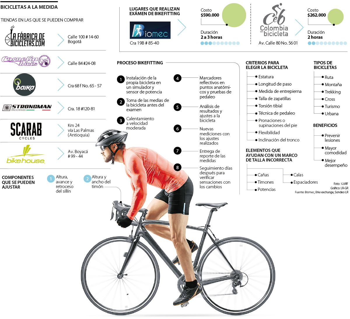 Biomec lo realiza con marcadores reflectivos de 1,4 centímetros de diámetro en puntos anatómicos para analizar los movimientos al montar bicicleta, identificando qué se puede corregir para aumentar la eficiencia al pedalear usando la misma energía. Pero Patricia Rojas de Colombia en Bicicleta, donde también se realiza el proceso, lo recomienda para antes de comprar la cicla.
