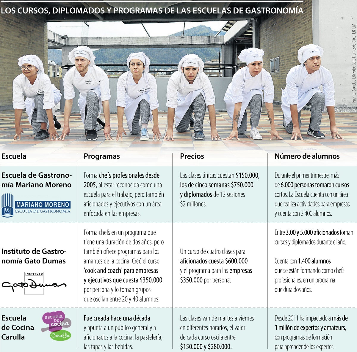 Con cinco sedes en el país, la Escuela de Gastronomía Mariano Moreno, al igual que Gato Dumas, cuenta con tres líneas de atención: la principal para quienes como Pájaro quieren dedicarse profesionalmente a la cocina, una para aficionados con cursos y diplomados y otra dirigida a las empresas.