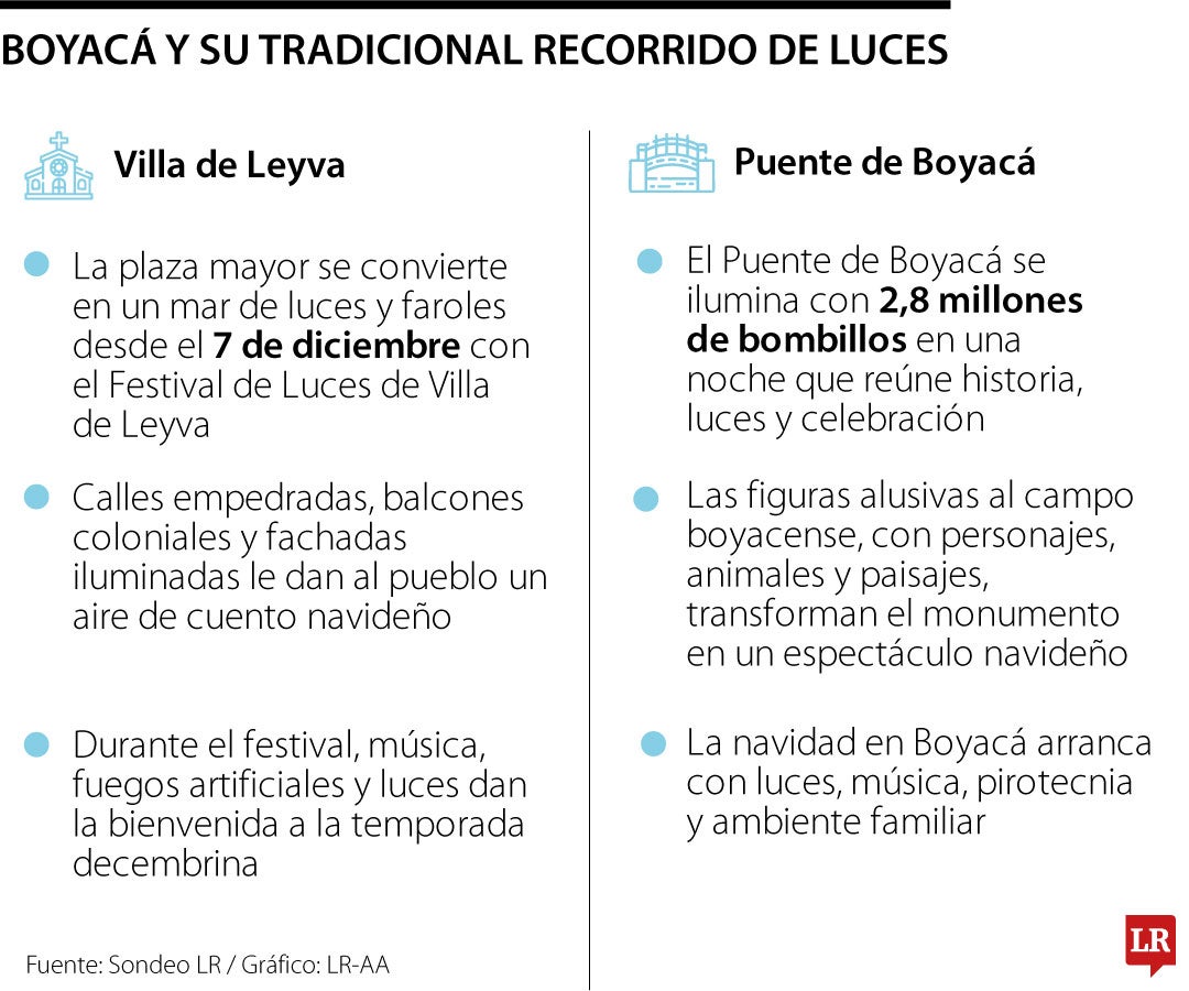 En cuanto a fechas, el encendido departamental en el Puente de Boyacá se realizó a finales de noviembre, mientras que el Festival de Luces de Villa de Leyva se desarrolló a comienzos de diciembre, tal como lo recogen las convocatorias publicadas por la Gobernación y las autoridades municipales.