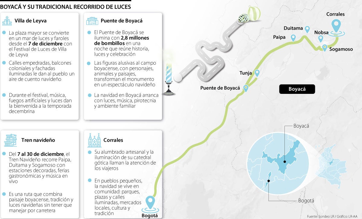 La llegada de diciembre vuelve a transformar Boyacá en un mapa de luces. Este año, la temporada navideña del departamento combina cercanía histórica en el Puente de Boyacá, festivales tradicionales en poblaciones como Villa de Leyva y la recuperación de recorridos turísticos por ferrocarril que permiten un modo distinto de visitar las luces y los eventos que las acompañan.