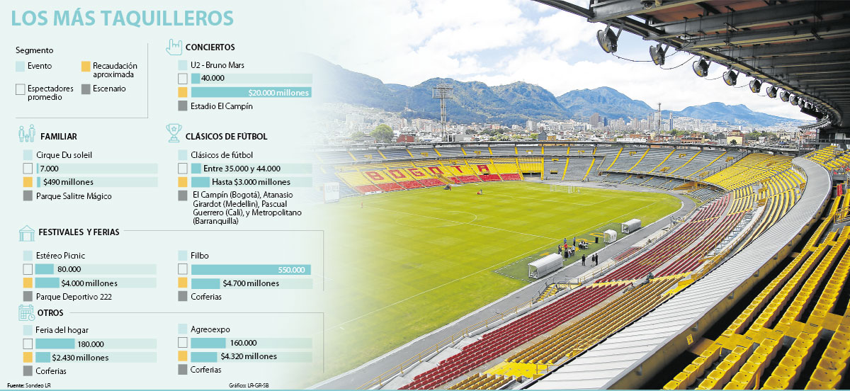 Según un informe de caracterización del recaudo de espectáculos en vivo presentado por Ocesa de la mano con el Portal Único de Espectáculos Públicos de las Artes Escénicas del Ministerio de Cultura, entre 2012 y 2017 los eventos que se realizaron en el estadio ‘El Campín’, el Atanasio Girardot y el Metropolitano de Barranquilla fueron los de mayor impacto superando cada jornada 35.000 asistentes en un solo día y en un periodo no mayor a cinco horas.