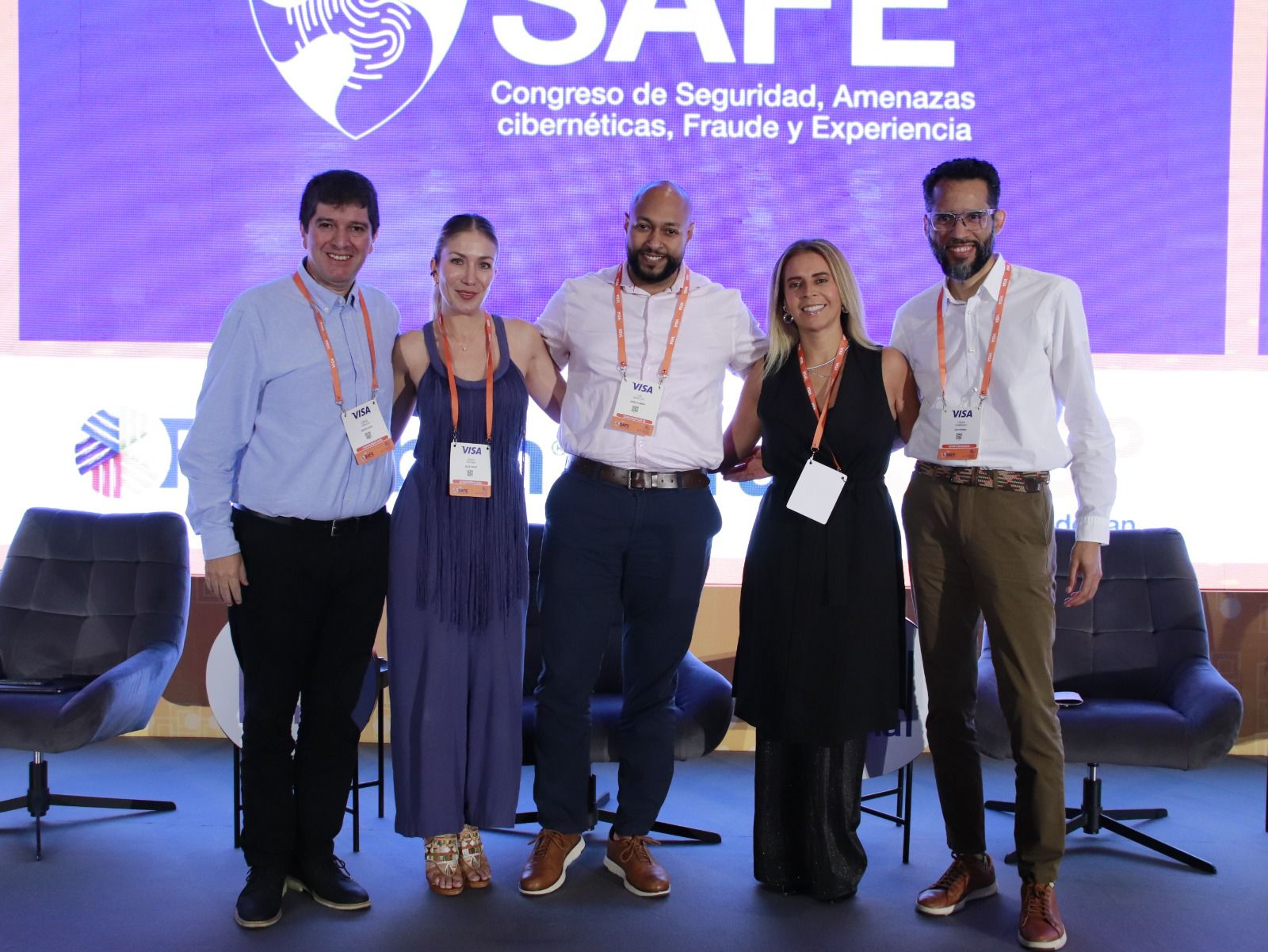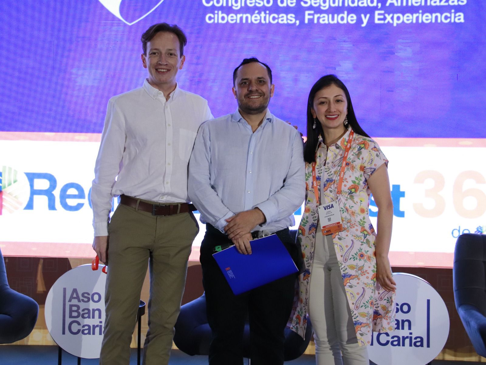Juan Camilo Reyes, manager de productos inteligentes de Mastercard para la región Andina; Wladi Gordillo, gerente de acceso de Credibanco; y Moises Santos, director senior de riesgo y control del ecosistema de pagos LAC de Visa.