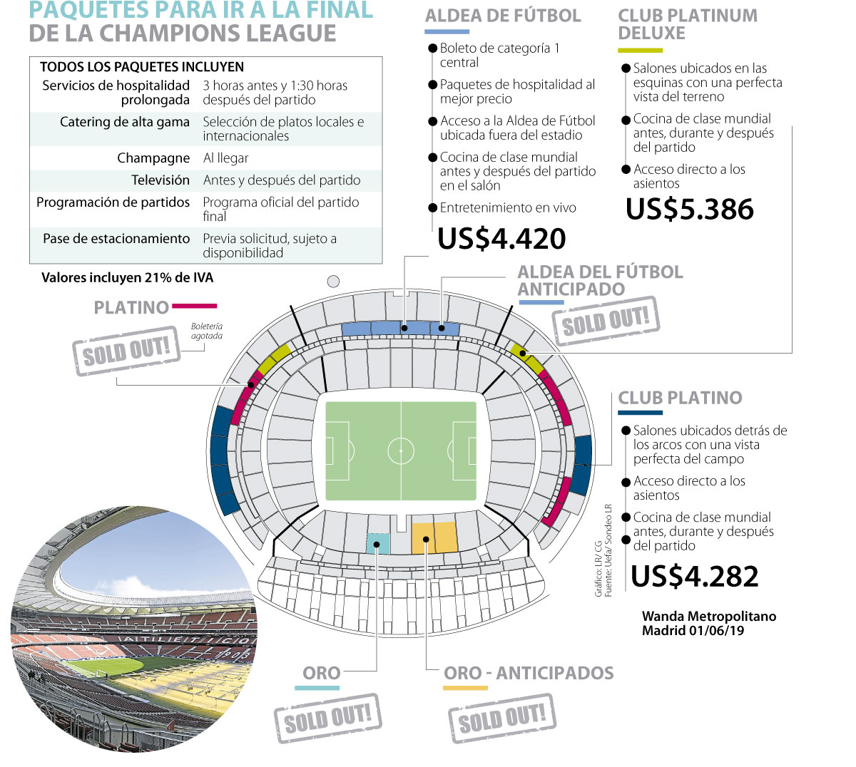 Uno de los paquetes disponibles que quedan en la página de la Uefa es ‘Aldea de Fútbol’, que además de lo anterior cuenta con acceso al Football Village ubicado fuera del estadio y boleto de categoría uno central en el stand opuesto. Tiene un valor de US$4.420. Otro de los planes es ‘Club Platino’, que incluye un boleto partido para el asiento del salón, acceso directo a los asientos y salones ubicados detrás de los arcos con una vista perfecta del campo. Este cuesta US$4.282.