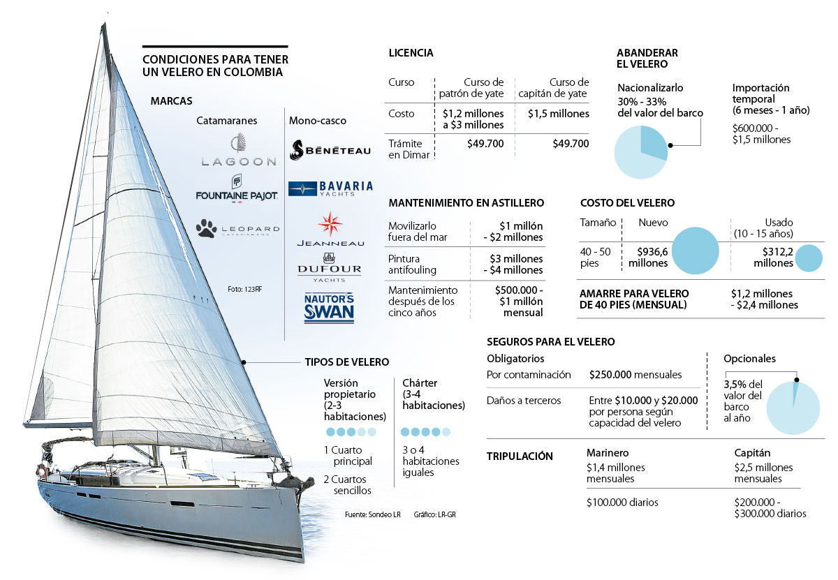 José Pérez, gerente de Navega Colombia, señaló que “un velero nuevo puede costar cerca de $936,6 millones. Sin embargo, si se quiere personalizar, el valor de la embarcación puede ascender entre 30% y 50%”. En caso de ser de segunda, podrá encontrar estas embarcaciones desde $312,2 millones, pero tendrá que contratar a un surveyor para que verifique si su estructura necesita cualquier arreglo.