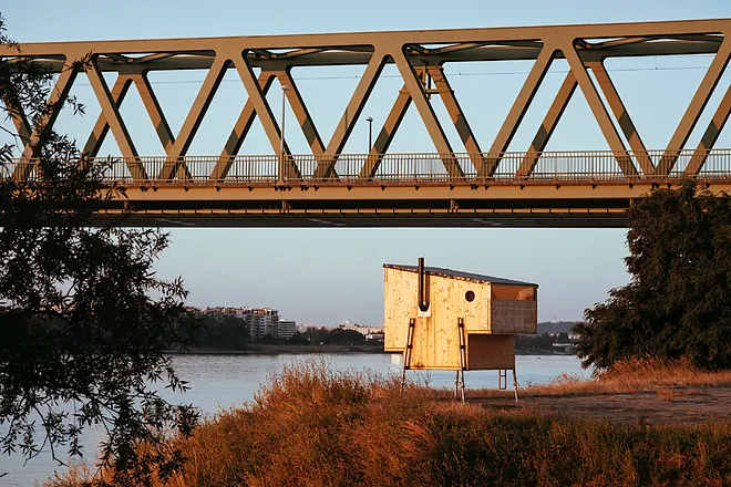 Primera incursión en el mundo sauna del estudio de arquitectura experimental Bivak Studio con sede en Budapest. Lo plantean a medio camino entre pabelló y caravana, de hecho, se ajusta a las dimensiones legales de los remolques en Hungría y se apoya sobre patas ajustables que permiten una rápida nivelación en terrenos irregulares.