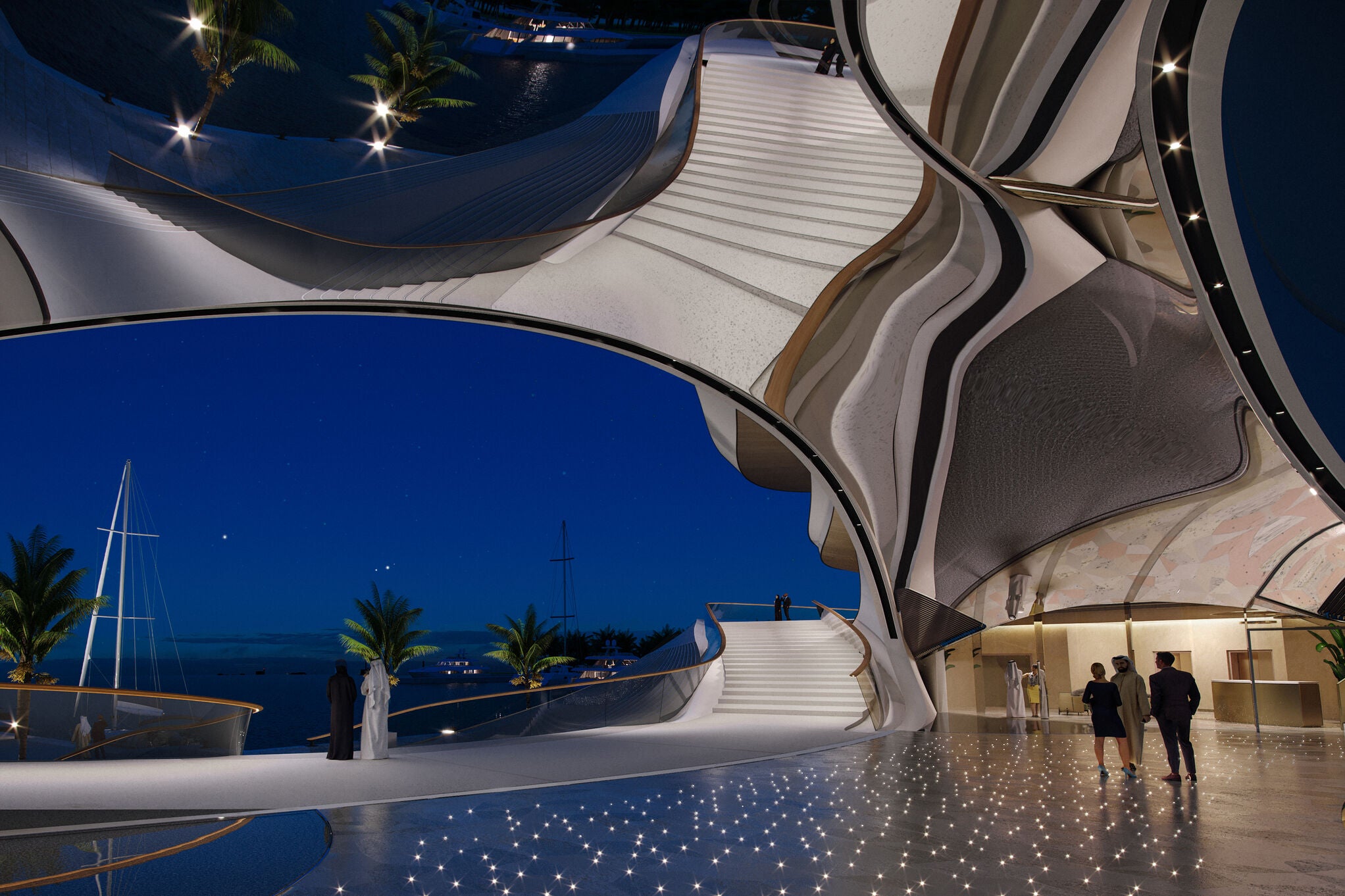 La obra quiere rendir homenaje a la larga relación entre el hombre y el mar. Esta historia marítima inspira el diseño del club perfectamente integrado en el puerto deportivo. Nadie que pasee por la zona puede permanecer indiferente a la grandiosidad de su entrada: un impresionante arco conduce a una plaza cubierta y enmarca las vistas del mar Rojo. El techo abovedado con espejos y el suelo cubierto de estrellas constituyen un cielo alternativo.