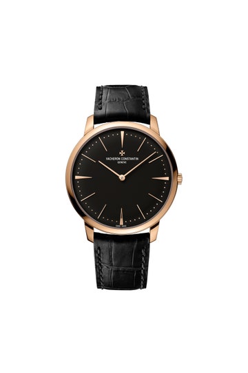 Vacheron Constantin tiene en su colección este reloj de diseño minimalista en negro y oro rosa. Cuenta con un brazalete de piel estilo cocodrilo y la caja puede ser personalizada. El oro rosa está de moda y otra opción es el Ballon Bleu de Cartier.