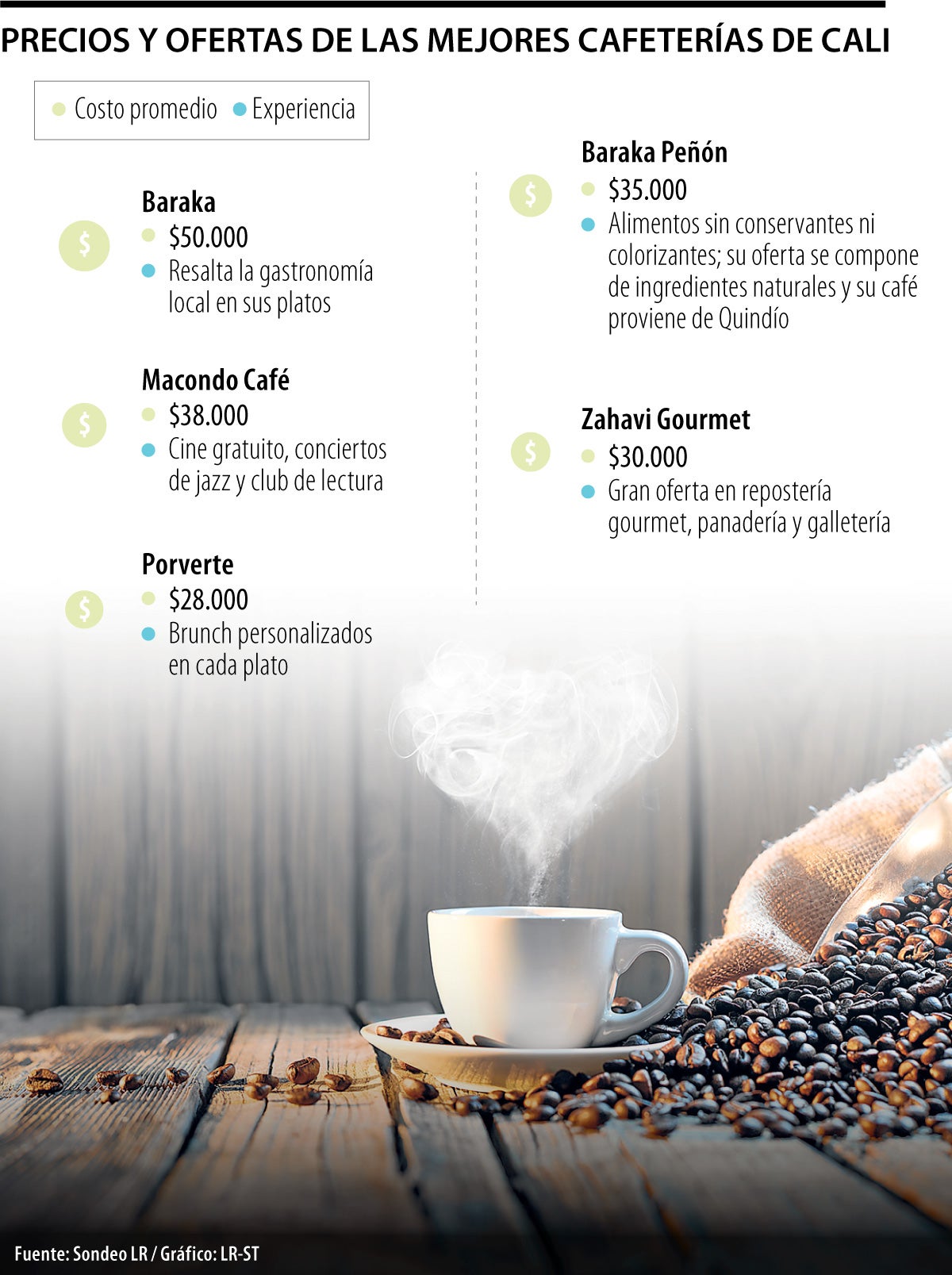 Santiago de Cali no escapa a la tradición y el hábito de degustar de una buena tasa de café. Es por ello que, desde LR decidimos traerle un listado de algunas de las mejores cafeterías de la capital vallecaucana, algunos de ellos son Baraka, Macondo Café, PorVerte, Baraka Peñón y Zahavi Gourmet.