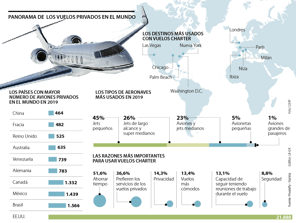 Según un estudio realizado por Statista, 51,6% de las personas que utiliza vuelos charter lo hace por ahorrar tiempo, siendo este el principal motivo; la segunda motivación es la calidad del servicio, pues afirman que es mucho mejor que en vuelos comerciales (36,6%); 14,3% los toma por la privacidad que representan y otro 13,4% lo hace pues los vuelos son más cómodos. Las aeronaves más usadas para estos fines en el mundo son los jets pequeños y los principales destinos son Nueva York, Londres, Niza, París e Ibiza.