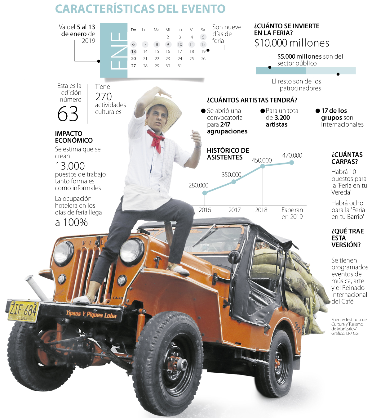 Para hacer posible esta convocatoria de artistas de talla nacional e internacional, los eventos, las 10 muestras de la ‘Feria en tu Vereda’, las ocho de la ‘Feria en tu Barrio’ y otras actividades, tanto el sector público como privado destinaron $10.000 millones, de los cuales, cerca de 50% provienen del sector público y el resto de los patrocinadores del evento, aseguró Héctor Ortiz, gerente del Instituto de Cultura y Turismo de Manizales.