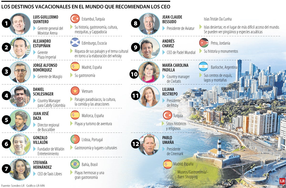 ¿Alguna vez se ha preguntando a dónde se iría de vacaciones un CEO? Un sondeo LR se dio a la tarea de preguntarle a 20 empresarios sobre sus destinos recomendados para visitar en vacaciones. Desde Asia hasta Latinoamérica se encuentra mapeado los lugares citados por directivos.