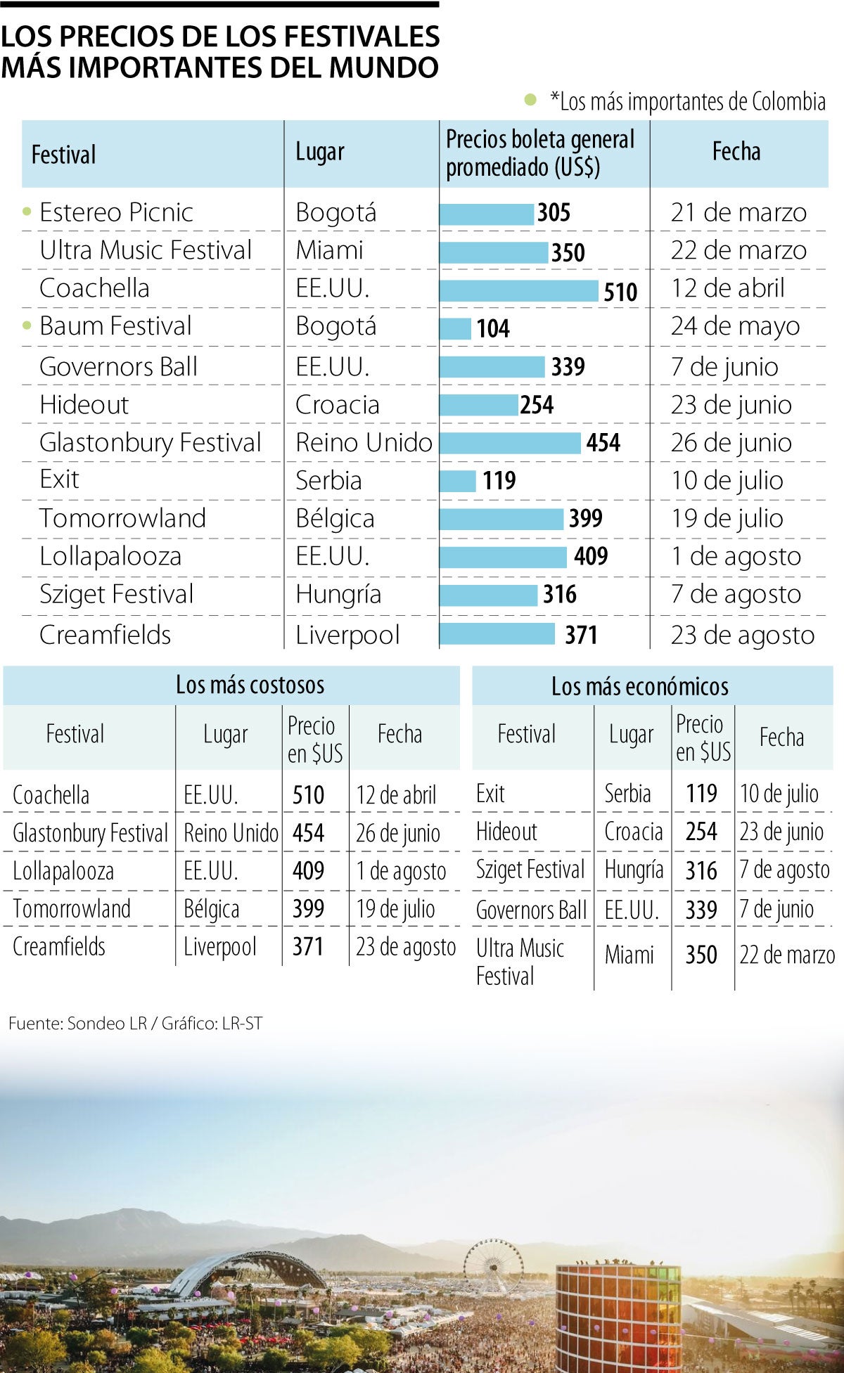 Ir a este, pero en Estados Unidos, le cuesta aproximadamente US$409. Inicia en agosto. Los otros más costosos son Tomorrowland (US399, precio boleta general) y Creamfields (US$371). En Colombia, el Festival Estereo Picnic, FEP, es uno de los más caros, su ticket promedio es de US$305.